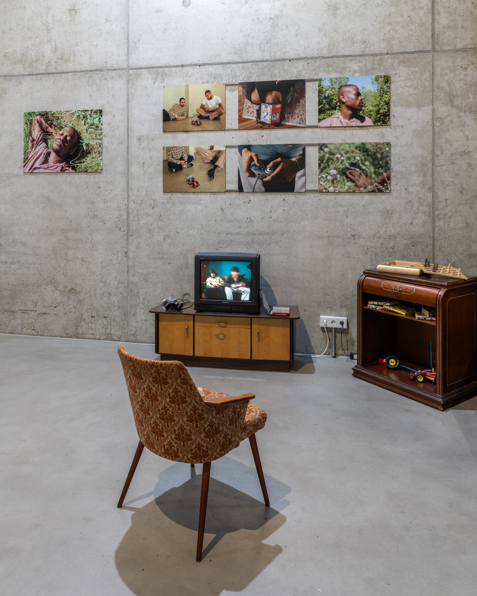 In a scenographic installation, Aleme Selassie creates a space of memory from his childhood, offering glimpses into a world that at first seems defined by domestic comfort and the joys of growing up: a tube television, comics, and the promise of Game Boy happiness. These objects mark a crystallizing moment – familiar at first glance, yet in their personal significance extending far beyond everyday items. They speak of an apparently ordinary life within a society in which belonging is repeatedly called into question. Everyday experiences, such as the recurring demand to explain one’s “real” origin, reveal how normality and exclusion intertwine and can shape the feeling of not fully belonging, despite social participation. In an analog photo series, Aleme Selassie returns to these motifs. In staged, cinematic and nostalgic images, he reenacts everyday situations of Black teenagers with adult models, casting a retrospective look at his own childhood while simultaneously questioning stereotypical media imagery.